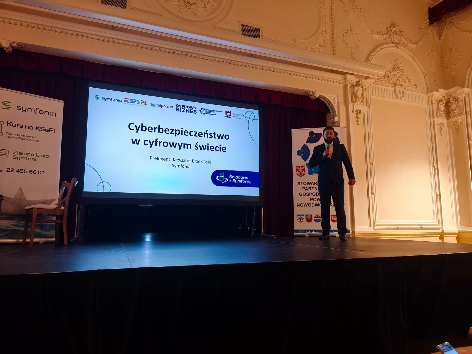 Kolejnym prelegentem był Krzysztof Brzeziński - Ekspert ds. cyberbezpieczeństwa Symfonia. W obecnym świecie czyha na nas sporo zagrożeń, przedstawił rodzaje w jak sposób złoczyńcy próbują dostać się do naszych danych oraz środków finansowych oraz jak sobie z tego typu zagrożeniami radzić.